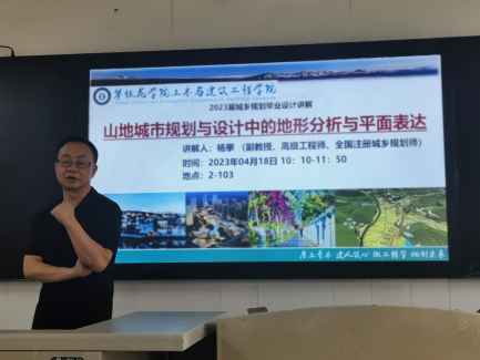 攀枝花学院土木与建筑工程学院,城乡规划教研室以“山地城市规划与设计中的地形分析与平面表达”为内容,为2023届城乡规划、建筑学毕业班学生提供了统一指导讲解,主讲人是国家注册城乡规划师、教研室教师杨攀老师,地点在2教103教室。