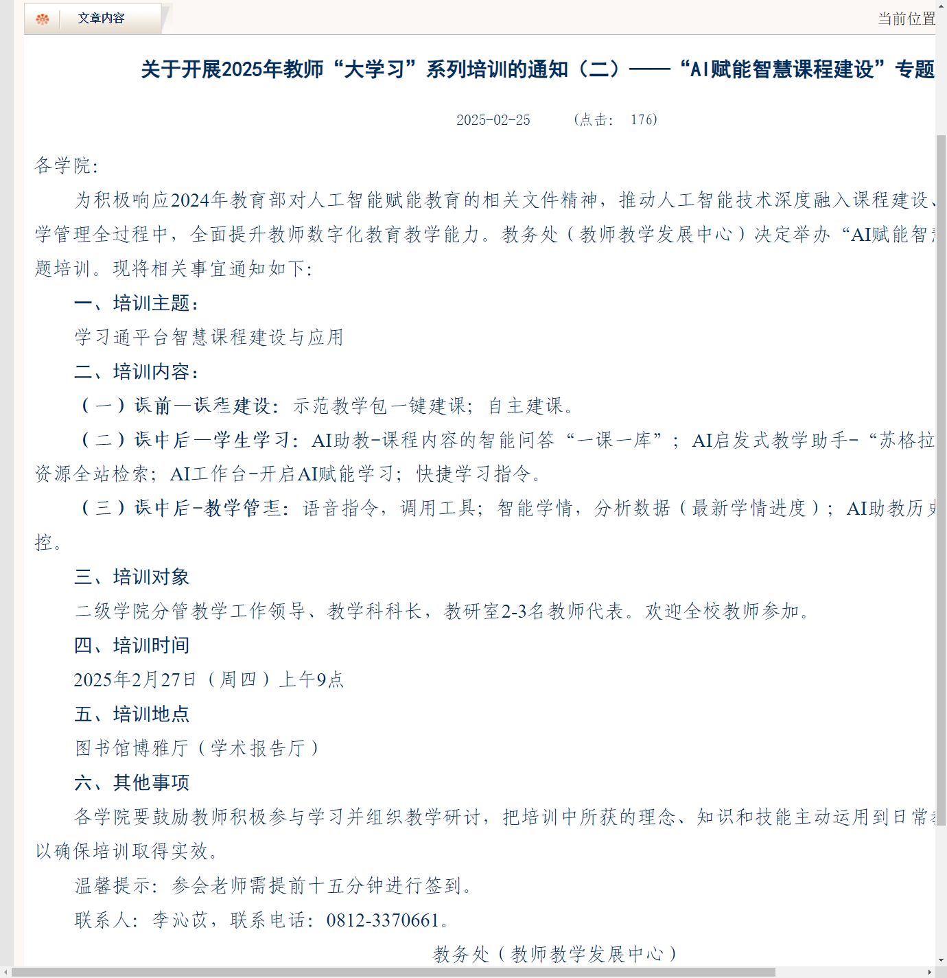 2月27日(周四)上午9:00在学校图书馆学术报告厅,教务处组织开展“AI赋能智慧课程建设”专题培训,请感兴趣老师参加。