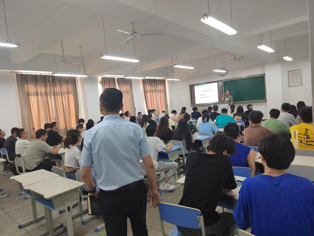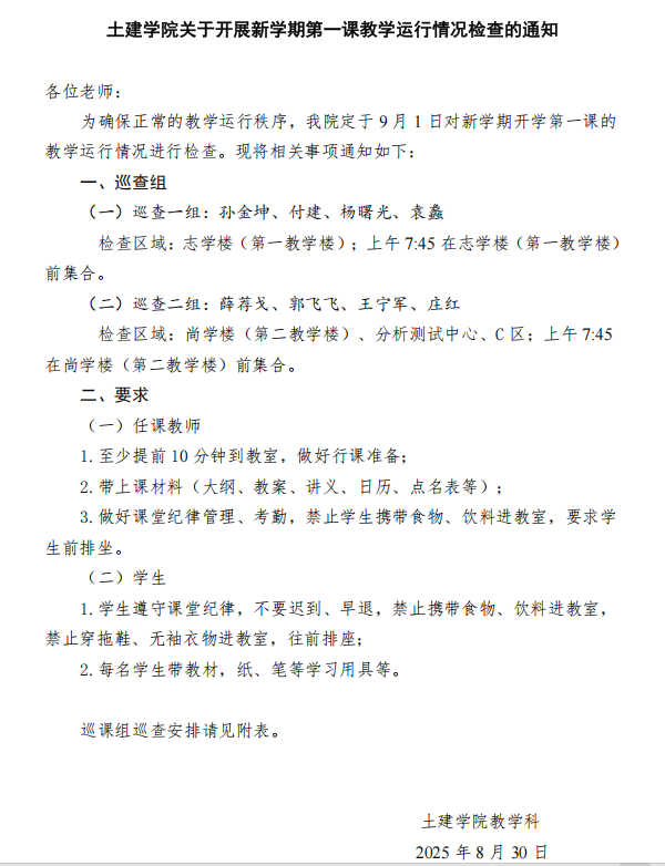 2025 年 9 月 1 日,新学期开学第一天,土建学院以一场全面的巡课行动,拉开了新学年教学工作的序幕。为切实掌握新学期第一课的开课情况,确保教学秩序平稳有序、教学质量稳步开局,学院组建了两支巡课小组 —— 分别由院长孙金坤、党委书记薛荐戈带队,副院长郭飞飞、副书记付建、学生科科长王宁军、实验室主任杨曙光,以及教研室主任袁蠡、庄红等领导与骨干教师共同参与,对尚学楼、志学楼等院内主要行课教室展开实地巡查。
