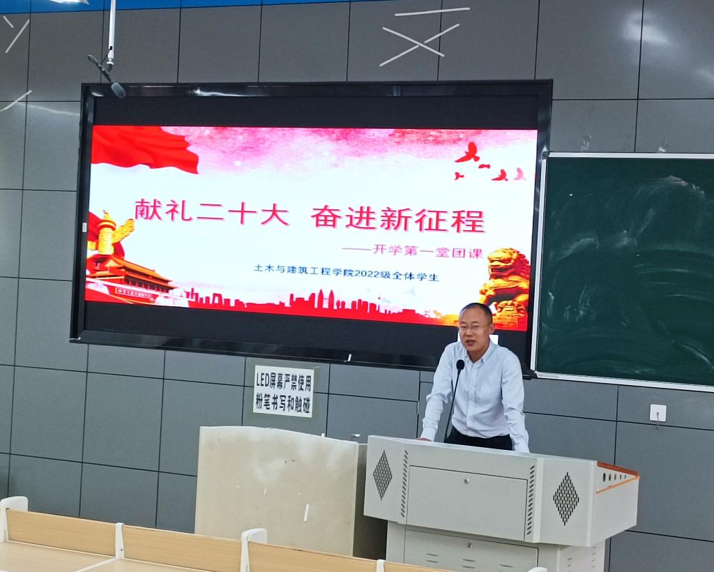 学院团委以“党的二十大 永远跟党走 奋进新征程”为主题开展2022-2023学年第一堂团课。本次活动创新采用线上线下联动、教师领学、支部研讨方式开展,线下成员为2022级新生及学院团委学生会主要团学干部。