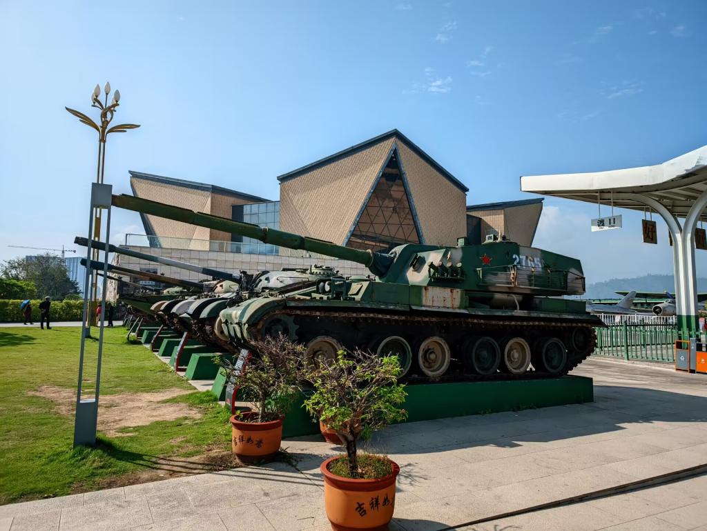 阳光将花瓣形的博物馆映照得金碧辉煌,博物馆正门右侧停放着解放军总装备部捐赠的坦克、大炮、装甲车。
