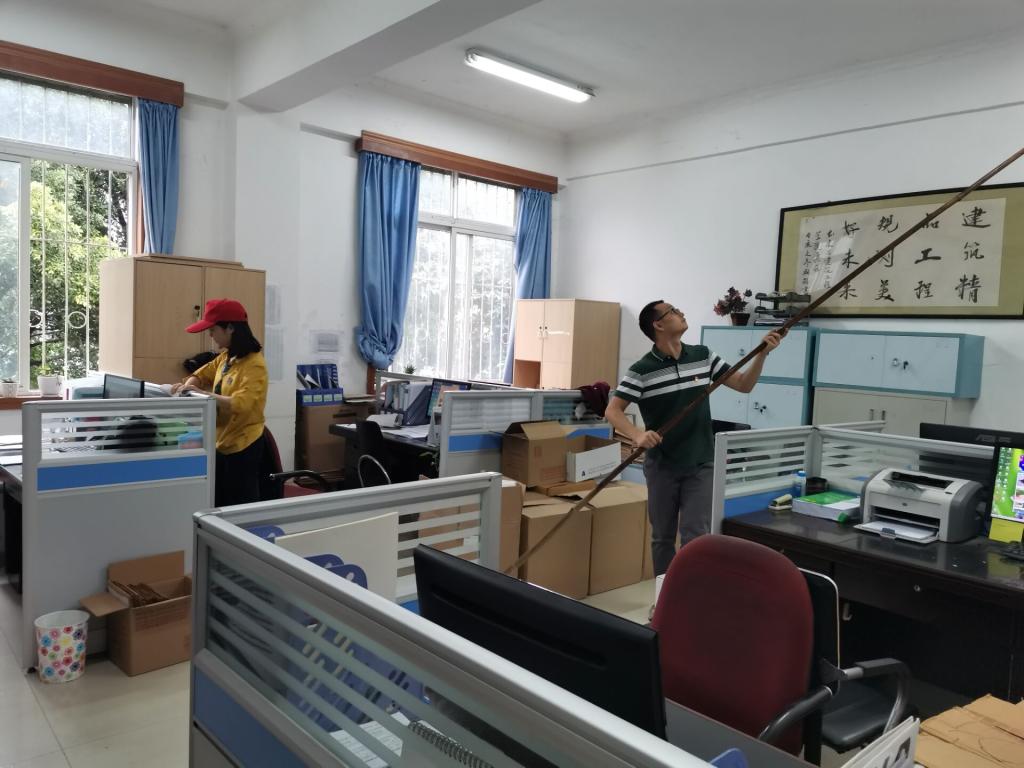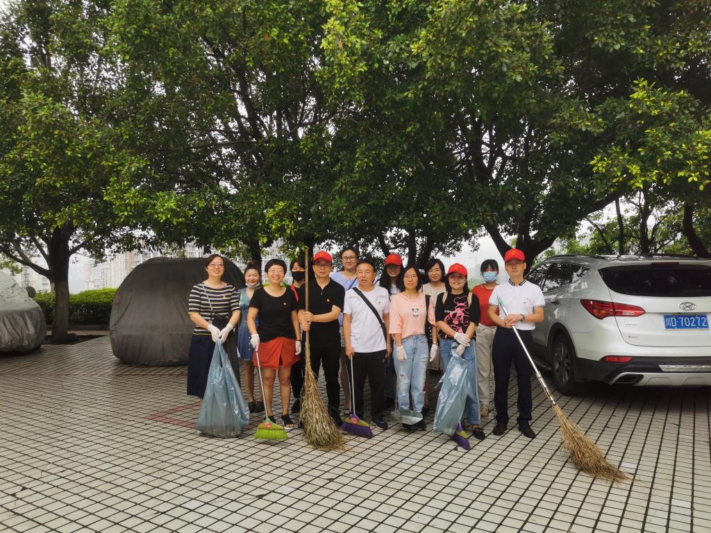 2020年7月1日上午,土建学院党员教职工在党委书记湛红艳的带领下,重温入党誓词。宣誓结束后,学院教工党员以党支部为单位,清扫办公室、励志楼周边空地和土建学院结构实验室的卫生,以党员志愿活动,庆祝党的99周岁生日。