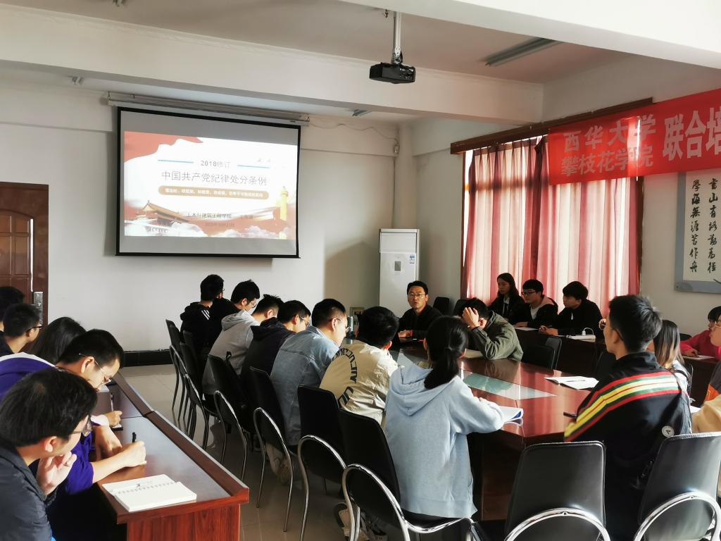 10月21日、10月23日下午,学院在励志楼2楼会议室分别组织教工党员和学生党员开展了《中国共产党纪律处分条例》集中学习。学院党委副书记、纪委书记结合案例和工作学习实际,从为什么要再次修订《条例》、新《条例》的修订内容、新《条例》的重点学习内容等方面进行了宣讲 。