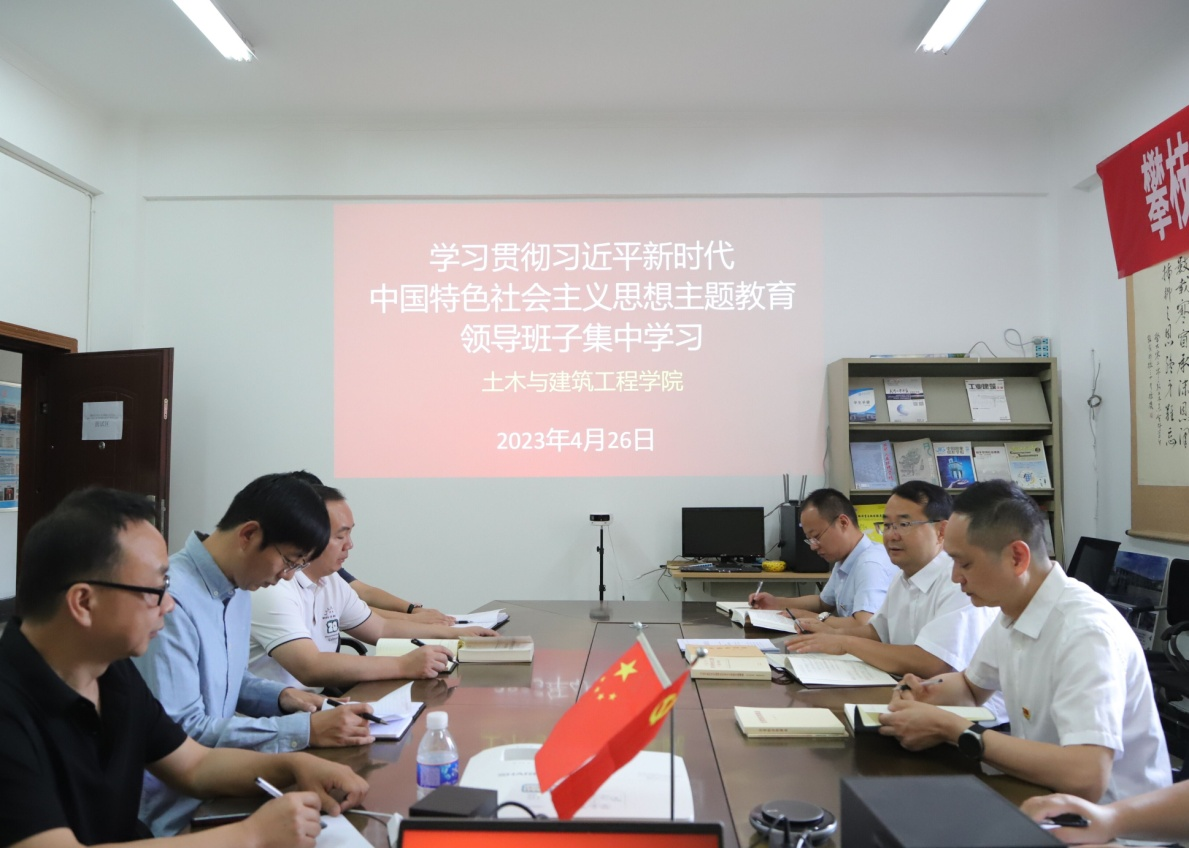 2023年4月26日,土木与建筑工程学院学习贯彻习近平新时代中国特色社会主义思想主题教育读书班第二次集体学习在111会议室举行,会议由党委书记张敬东主持,学院院领导、两委委员、教工党支部书记、教研室主任代表及教师代表等参加学习。此次读书班主要任务为学习《习近平著作选读》第二卷,每个院领导领学一个主题,并交流学习体会。