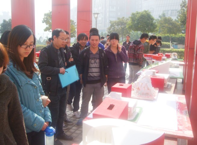活动伊始,由举办方向各位参赛选手发放此次人气比拼投票专用票,亲友团们纷纷为自己支持的选手投上一票,前来观看此次比赛的师生更是络绎不绝,在欣赏的同时他们也不忘为自己心仪的作品投上一票。与此同时,李坤老师仔细的观看和了解本次建模大赛的建筑模型设计,并结合自己所学从钢结构搭配、绿化协调、比例设计等方面对现场作品分别作出简评。