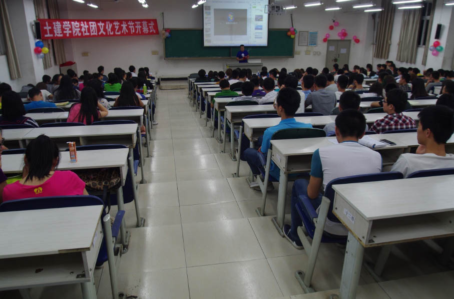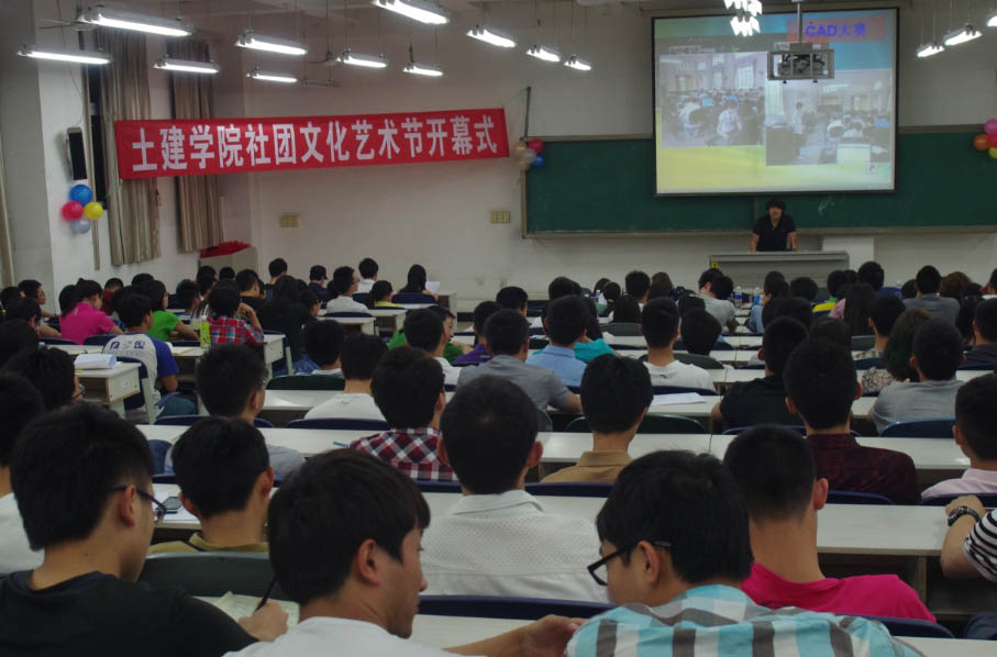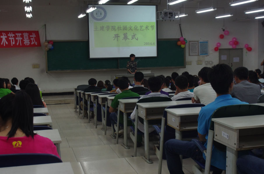 2014年4月3日晚8点,在二教2-2教室,土木与建筑工程学院隆重举行土建学院首届社团艺术节开幕式。土建学院党总支副书记崔朝晖、分团委负责人姜承琳、数名学科竞赛专业指导教师以及200余名土建学子参加了开幕式。